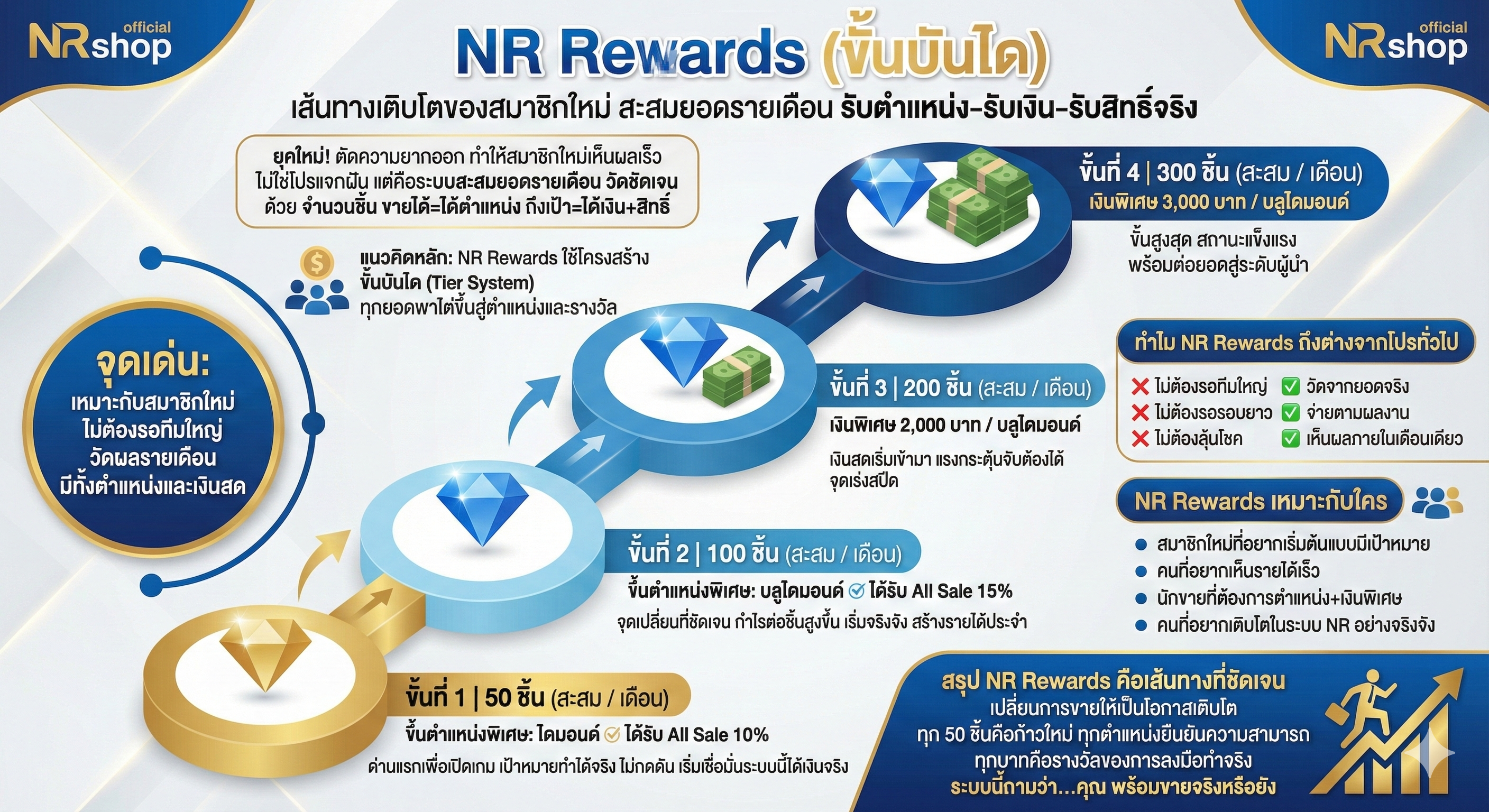 NR Rewards (ขั้นบันได) เส้นทางเติบโตของสมาชิกใหม่ สะสมยอดรายเดือน รับตำแหน่ง–รับเงิน–รับสิทธิ์จริง ในยุคที่หลายโปรแกรมขายตรงหรือระบบตัวแทนเต็มไปด้วยเงื่อนไขซับซ้อน NR Rewards (ขั้นบันได) ถูกออกแบบขึ้นมาเพื่อ “ตัดความยากออก” และ “ทำให้สมาชิกใหม่เห็นผลเร็ว” นี่ไม่ใช่โปรแจกฝัน แต่คือระบบสะสมยอด รายเดือน ที่วัดกันชัดเจนด้วย “จำนวนชิ้น” ขายได้ = ได้ตำแหน่ง ถึงเป้า = ได้เงิน + สิทธิ์ แนวคิดหลักของ NR Rewards NR Rewards ใช้โครงสร้าง ขั้นบันได (Tier System) หมายความว่า ทุกยอดที่คุณขาย ไม่สูญเปล่า แต่จะพาคุณไต่ขึ้นไปสู่ตำแหน่งและรางวัลที่สูงขึ้นเรื่อย ๆ จุดเด่นของระบบนี้คือ เหมาะกับ สมาชิกใหม่ ไม่ต้องรอทีมใหญ่ วัดผลเป็นรายเดือน เห็นผลเร็ว มีทั้ง “ตำแหน่ง” และ “เงินสด” โครงสร้างรางวัล NR Rewards (สะสม / เดือน) 🔹 ขั้นที่ 1 | 50 ชิ้น ขึ้นตำแหน่งพิเศษ: ไดมอนด์ ✔ ได้รับ All Sale 10% นี่คือด่านแรกที่ออกแบบมาเพื่อ “เปิดเกม” สำหรับสมาชิกใหม่ที่เพิ่งเริ่มต้น การขาย 50 ชิ้นใน 1 เดือน คือเป้าหมายที่ทำได้จริง ไม่กดดัน ประโยชน์สำคัญ ได้ตำแหน่งทันที ได้เปอร์เซ็นต์ All Sale เพิ่ม เริ่มเห็นรายได้ที่มากกว่าการขายปกติ ตำแหน่งไดมอนด์ คือจุดที่ทำให้หลายคน “เริ่มเชื่อมั่นว่าระบบนี้ได้เงินจริง” 🔹 ขั้นที่ 2 | 100 ชิ้น ขึ้นตำแหน่งพิเศษ: บลูไดมอนด์ ✔ ได้รับ All Sale 15% เมื่อยอดสะสมแตะ 100 ชิ้น สมาชิกจะถูกอัปเกรดเป็น บลูไดมอนด์ ซึ่งถือเป็นตำแหน่งสำคัญของนักขายที่เริ่ม “จริงจัง” จุดเปลี่ยนที่ชัดเจน All Sale เพิ่มเป็น 15% กำไรต่อชิ้นสูงขึ้นทันที เริ่มมีศักยภาพในการสร้างรายได้ประจำ หลายคนที่ถึงขั้นนี้ จะเริ่มวางแผนขายเป็นรอบ เป็นระบบ ไม่ใช่ขายแบบวันต่อวันอีกต่อไป 🔹 ขั้นที่ 3 | 200 ชิ้น เงินพิเศษ 2,000 บาท / บลูไดมอนด์ นี่คือขั้นที่ “เงินสดเริ่มเข้ามาเป็นรางวัล” นอกจากรายได้จากการขายปกติ สมาชิกบลูไดมอนด์ที่ทำยอดถึง 200 ชิ้นต่อเดือน จะได้รับ เงินพิเศษ 2,000 บาท เพิ่มทันที เหตุผลที่ขั้นนี้สำคัญ เงินพิเศษคือแรงกระตุ้นที่จับต้องได้ ทำให้เห็นว่าระบบให้รางวัลกับคนลงมือทำจริง เป็นจุดเร่งสปีดก่อนถึงขั้นสูงสุด 🔹 ขั้นที่ 4 | 300 ชิ้น เงินพิเศษ 3,000 บาท / บลูไดมอนด์ ขั้นสูงสุดของ NR Rewards สำหรับสมาชิกใหม่ คือการทำยอดสะสม 300 ชิ้นใน 1 เดือน สิ่งที่ได้รับ เงินพิเศษ 3,000 บาท สถานะบลูไดมอนด์ที่แข็งแรง โปรไฟล์นักขายที่พร้อมต่อยอดสู่ระดับผู้นำ ขั้นนี้ไม่ใช่เรื่องบังเอิญ แต่เป็นผลลัพธ์ของคนที่ “เข้าใจระบบ + ลงมือทำต่อเนื่อง” ทำไม NR Rewards ถึงต่างจากโปรทั่วไป ❌ ไม่ต้องรอทีมใหญ่ ❌ ไม่ต้องรอรอบยาว ❌ ไม่ต้องลุ้นโชค แต่เป็น ✅ วัดจากยอดจริง ✅ จ่ายตามผลงาน ✅ เห็นผ
