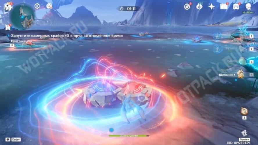 Um die Steinkrabben im Teich freizusetzen, sprechen Sie zunächst mit dem NPC und wählen Sie im Dialog die Option „Lass es uns versuchen!“. Dadurch starten Sie das Krustentierspiel, bei dem es gilt, innerhalb von 5 Minuten und 1 Sekunde insgesamt 30 Steinkrabben in den Teich zu werfen. Der Fortschrittsstand beginnt bei 0/5 und erhöht sich mit jeder erfolgreichen Aktion.