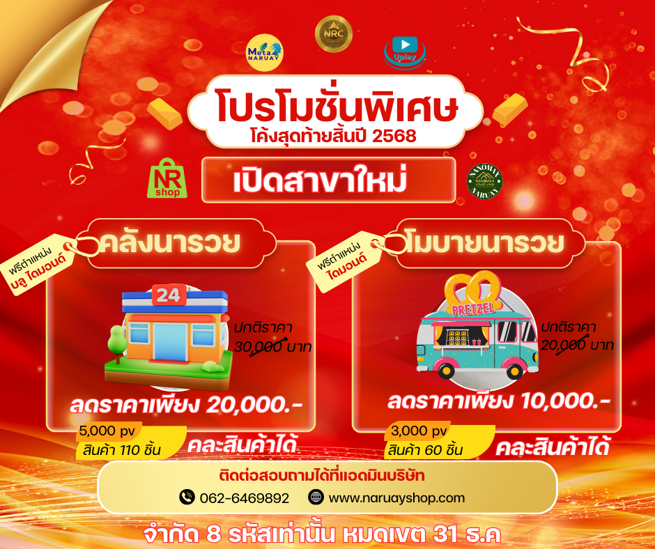 🎉🔥 โปรแรงส่งท้ายปี 2568! โอกาสทองของคนอยากมีธุรกิจเป็นของตัวเอง 🔥🎉 💥 นารวย เปิดสาขาใหม่ พร้อมแพ็กเกจสุดคุ้ม 💥 ลดจริง จำกัดจริง หมดแล้วหมดเลย! 🏪 คลังนารวย 👉 ปกติราคา 30,000 บาท 🔥 เหลือเพียง 20,000 บาท ✔️ 5,000 PV ✔️ สินค้า 110 ชิ้น ✔️ คละสินค้าได้ 🚚 โมบาย นารวย 👉 ปกติราคา 20,000 บาท 🔥 เหลือเพียง 10,000 บาท ✔️ 3,000 PV ✔️ สินค้า 60 ชิ้น ✔️ คละสินค้าได้ 🎯 เหมาะสำหรับ ✅ คนอยากเริ่มธุรกิจ ✅ คนอยากมีรายได้เสริม ✅ คนอยากมีร้านของตัวเองแบบไม่เสี่ยง ⏰ จำกัดเพียง 8 รหัสเท่านั้น 📆 หมดเขต 31 ธันวาคมนี้ 📲 สอบถาม / จองสิทธิ์ด่วน ☎️ 062-6469892 🌐 www.naruayshop.com 🚀 ปีนี้อย่าปล่อยให้โอกาสหลุดมือ เริ่มต้นวันนี้ = รายได้ปีหน้า #โปรส่งท้ายปี #เปิดสาขานารวย #ธุรกิจนารวย #คลังนารวย #โมบายนารวย #โอกาสสร้างรายได้ #เริ่มต้นธุรกิจ #นารวย
